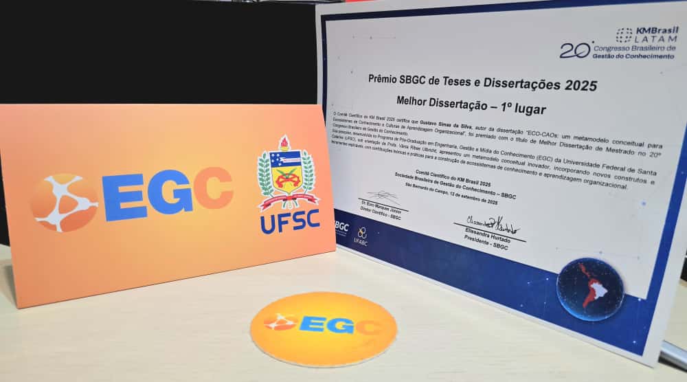O Comitê Científico do KM Brasil 2025 certifica que Gustavo Simas da Silva, autor da dissertação “ECO-CAOs: um metamodelo conceitual para Ecossistemas de Conhecimento e Culturas de Aprendizagem Organizacional”, foi premiado com o título de Melhor Dissertação de Mestrado no 20 Congresso Brasileiro de Gestão do Conhecimento. Sua pesquisa, desenvolvida no Programa de Pós-Graduação em Engenharia, Gestão e Mídia do Conhecimento (EGC) da Universidade Federal de Santa Catarina (UFSC), sob orientação da Profa. Vânia Ribas Ulbricht, apresentou um metamodelo conceitual inovador, incorporando novos construtos e ferramentas replicáveis, com contribuições teóricas e práticas para a construção de ecossistemas de conhecimento e aprendizagem organizacional.